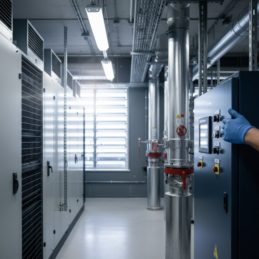 Technician in navy safety gear inspecting HVAC control panel in a high-tech, clean plant room.